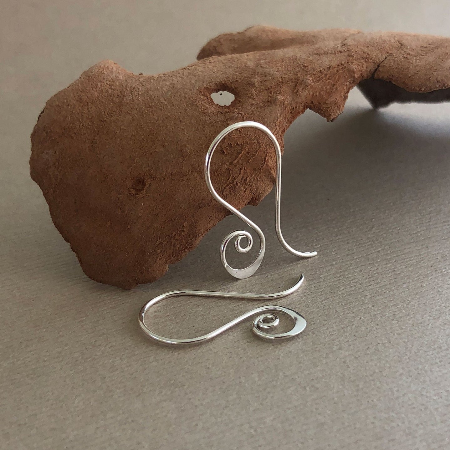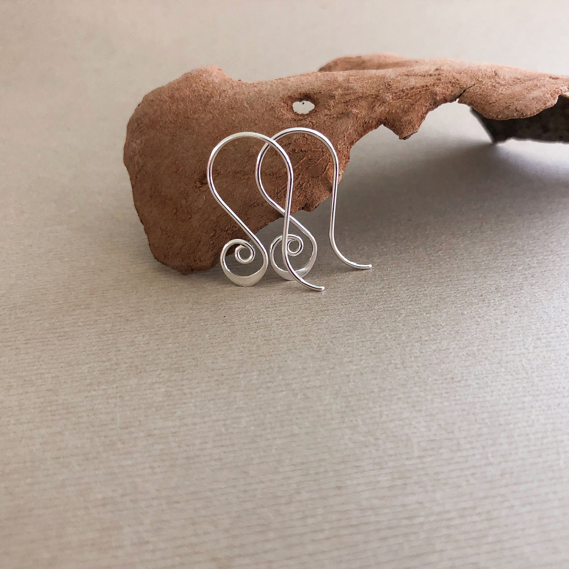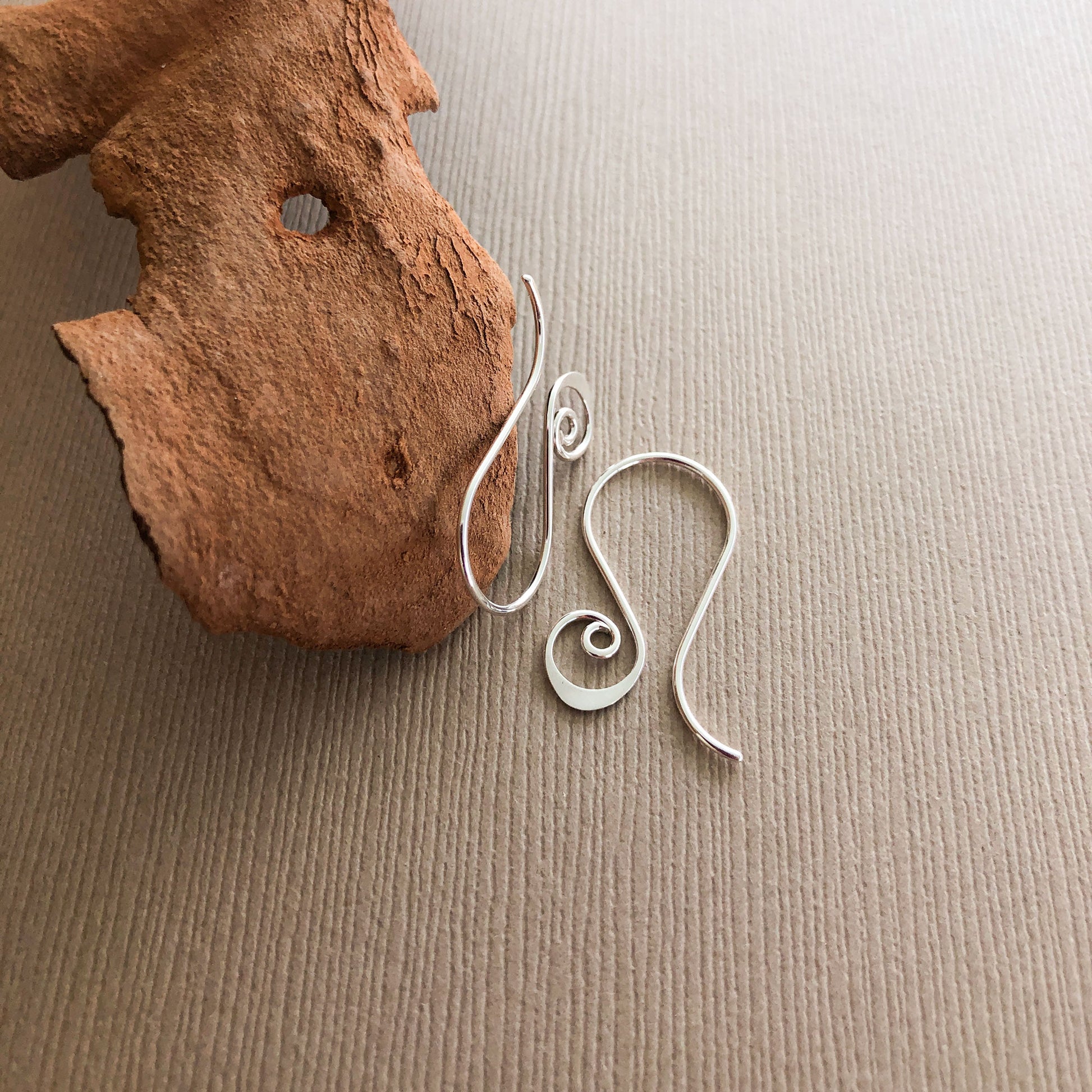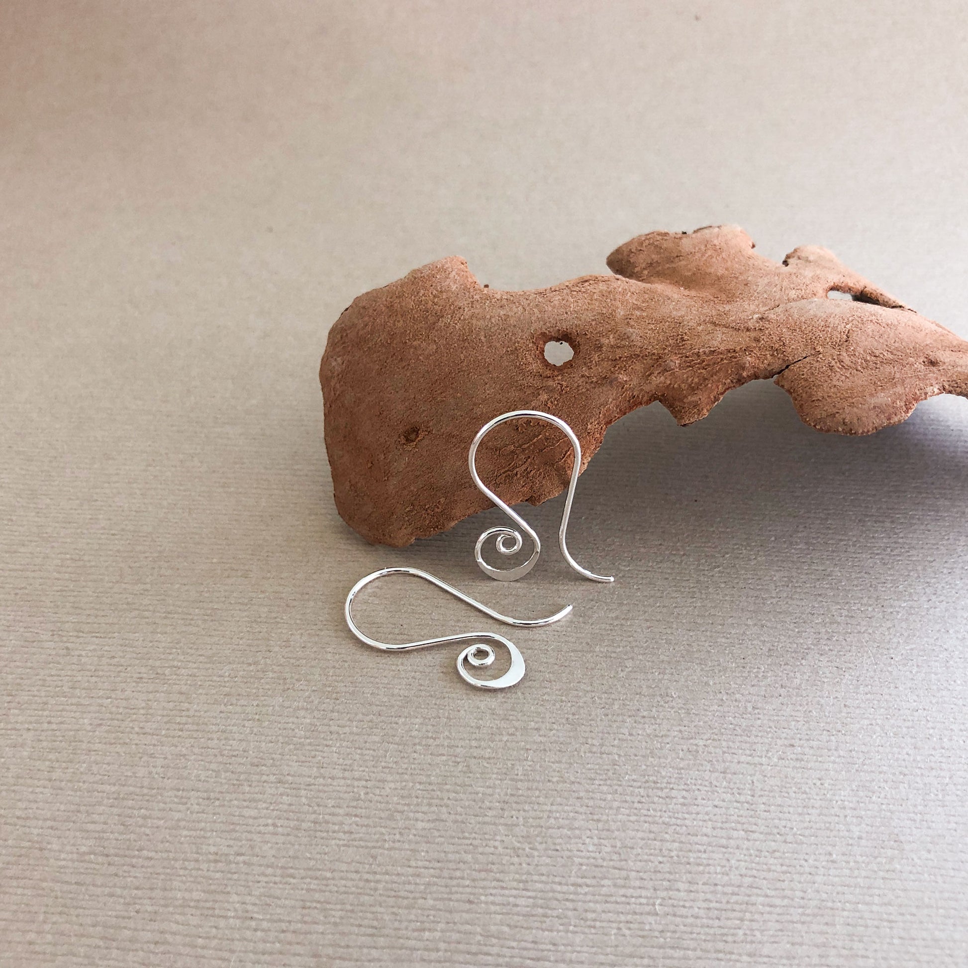 I made these spiral earring hooks using 20 gauge .925 sterling silver wire. I hand formed the ear wires and then gradually hammered the bottoms of the spirals to make them more interesting. The ends have been rounded and smoothed for a nice fit. The ear wires were then sanded (to remove any tool marks) and tumbled for extra strength. These are great to use as interchangeable ear wires as well.
